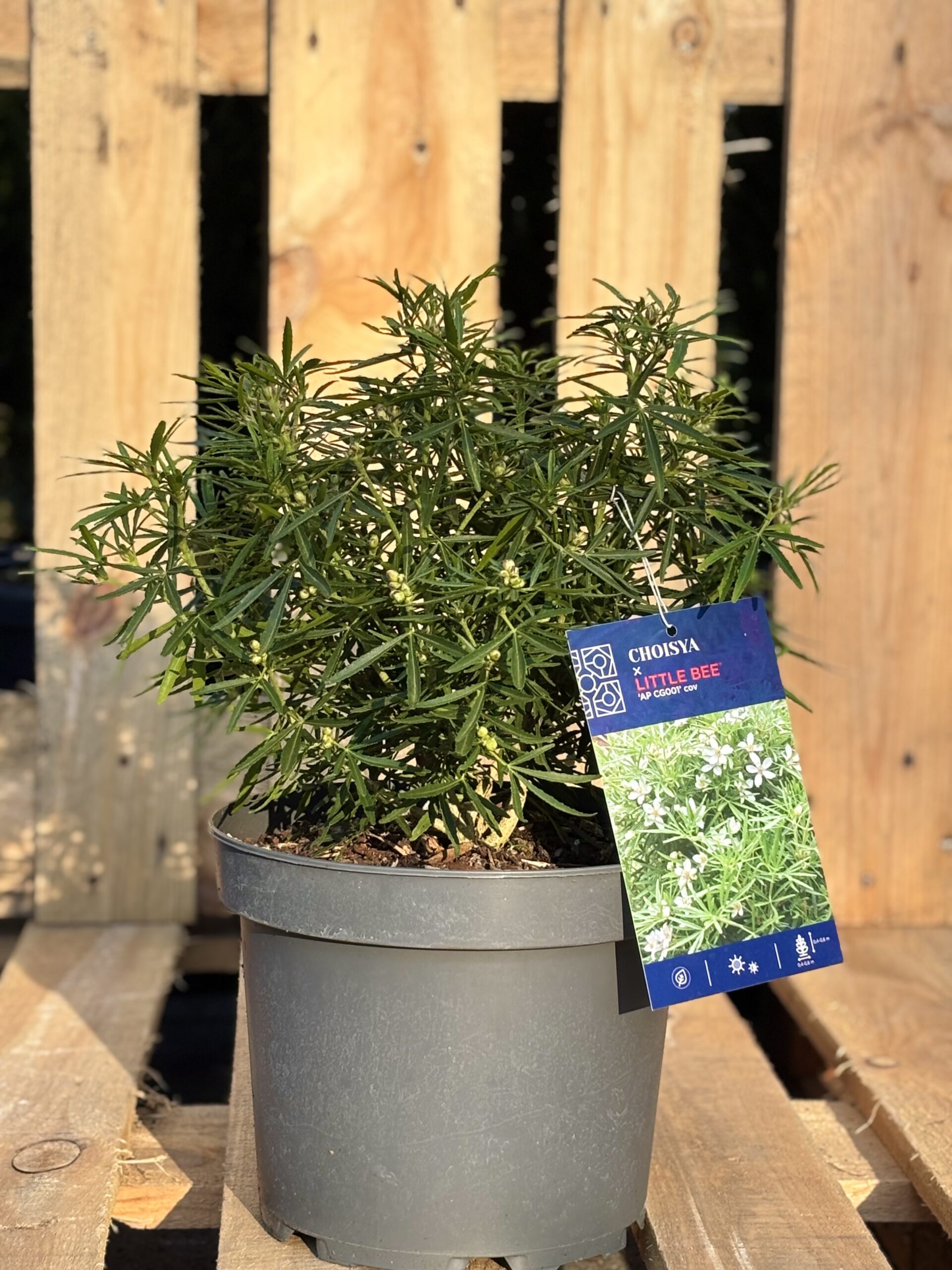 Die Choisya ‘Little Bee’, auch bekannt als Orangenblume, gehört zu den beliebtesten immergrünen Blütensträuchern für den Garten. Ihren Namen verdankt sie dem intensiven Duft ihrer weißen Blüten, der stark an Orangenblüten erinnert.