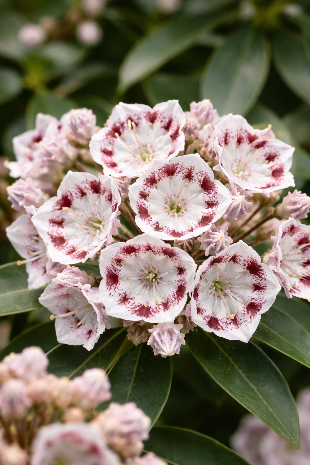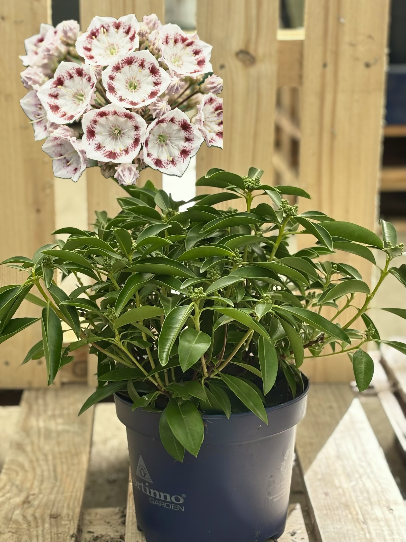 Die Kalmia latifolia ‘Elf’, auch bekannt als Lorbeerrose, begeistert mit ihren eleganten, reinweißen Blüten und feinen rosa Akzenten im Inneren. Diese außergewöhnliche Blütenform wirkt fast wie aus Porzellan und macht sie zu einem echten Highlight im Garten oder auf der Terrasse.